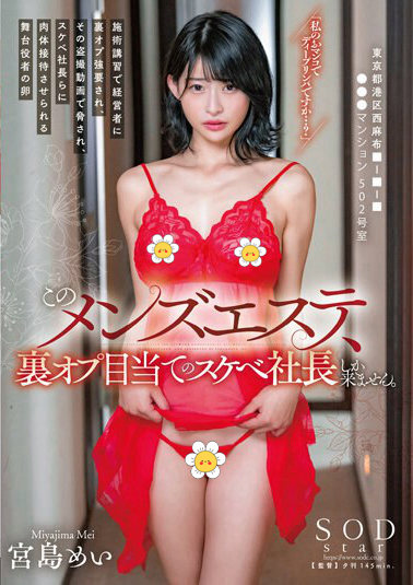 剧情简介:东京都港区西夏札部●●大厦 502 室]乍一看,这是一个普通而不起眼的公寓。 当您乘坐电梯上楼,按响 502 号房间的乒乓球铃时,一位穿着性感内衣的可爱女孩迎面走来。 只有肮脏的老板才会来这家男士美容沙龙。 舞台剧演员宫岛梅(Mei Miyajima)找到了一种不屈服于邪恶经理的生活方式。
