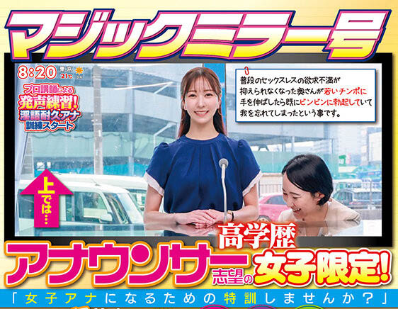 是什么来了呢?是佐藤爱瑠的第一支作品来了,在SOD Create 的作品『マジックミラー号 アナウンサー志望の高学歴女子限定!「女子アナになるための特训しませんか?」原稿を読んでる最中にイタズラされても、ハメられても、イキそうになっても何があってもカメラ目线!!』中,她上了魔镜号,在众目睽睽之下被男优疯狂抽插,顶到升天!