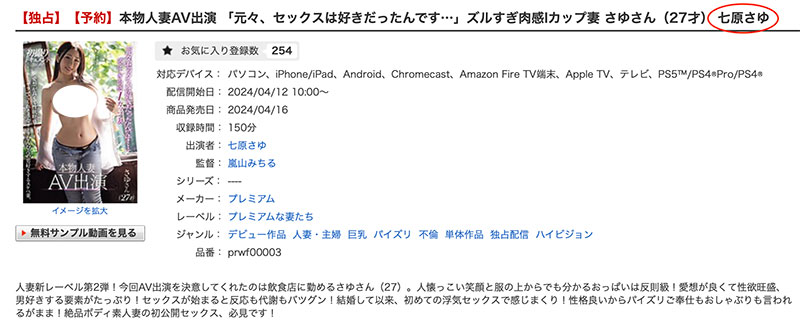 从上一篇仓本すみれ(仓本蓳)作品漏打马赛克的报导你就知道片商做事没那么仔细,虽然Premium官网没标她的艺名,但到了FANZA的销售页面就可以发现不但完整的艺名有了就连女演员的连结也弄好了ー而透过「七原さゆ(七原纱由)」这个名字很快就可以找到她的社群(https://twitter.com/nanaharasayu),她正是铃村あいり(铃村爱里)和伊藤舞雪的学妹,是事务所NAX Promotion的一员: